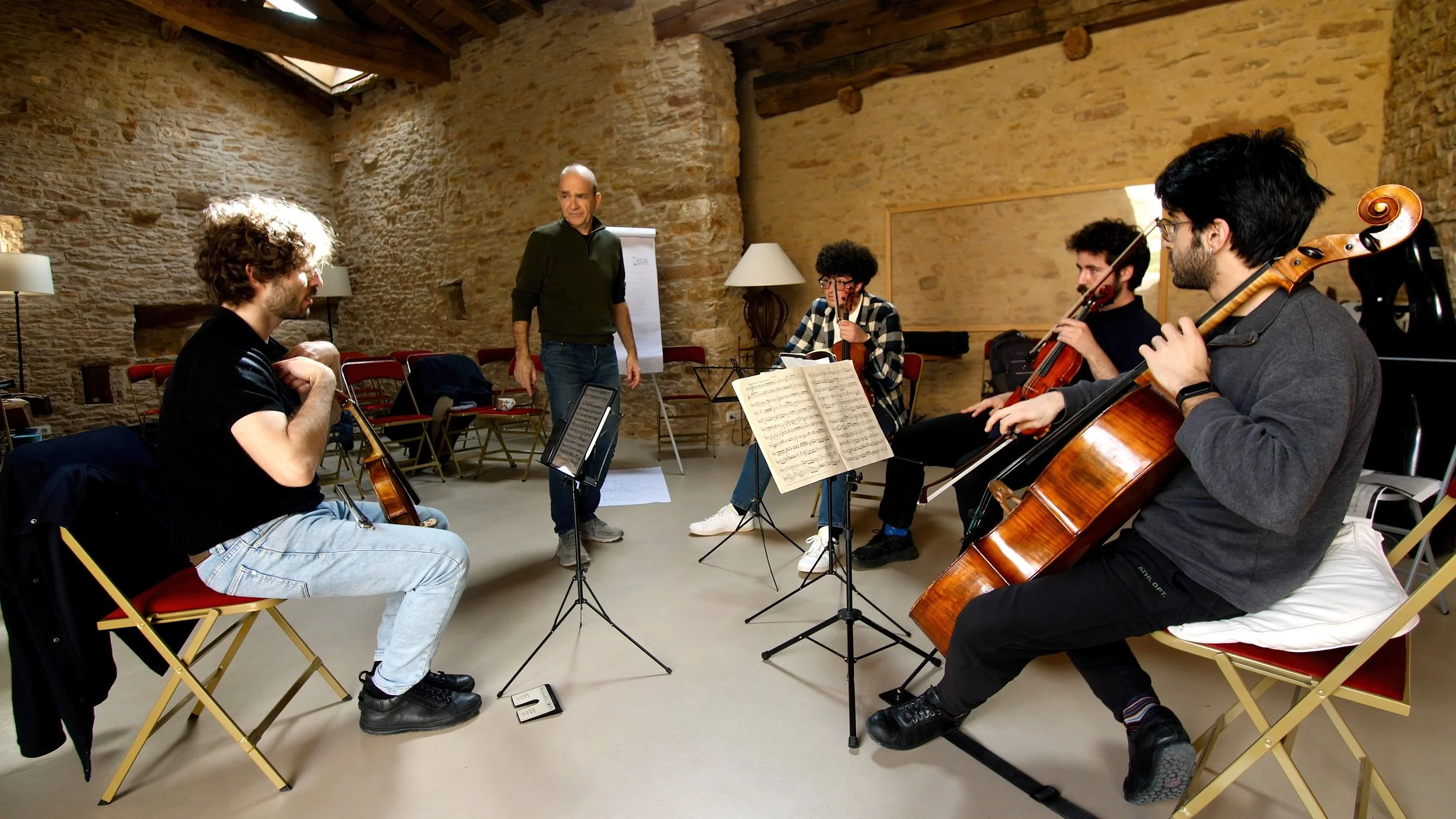 David mentoring the New Cretan Quartet at a residency in Pressoir de Monceau, France, 2023 - photo by Alexis Lardilleux